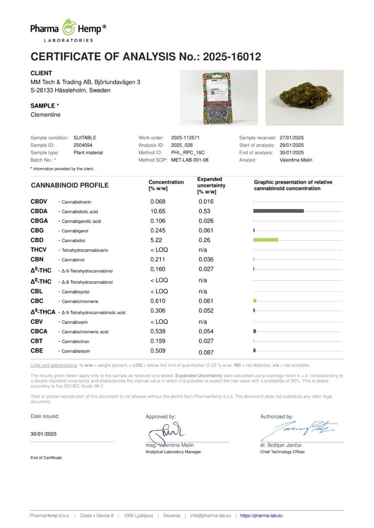 Blommorna på Clementine är täta och varierar i storlek, med tydliga orangea pistiller och ett lager av trikomer som ger ett fräscht intryck. De är välkurerade för att bevara en optimal fuktighet och har en cannabinoidhalt mellan 17–19%, med THC-halten under 0,3%. Clementine är ett balanserat val för den som uppskattar citrusdoftande CBD-blommor.Doft och arom