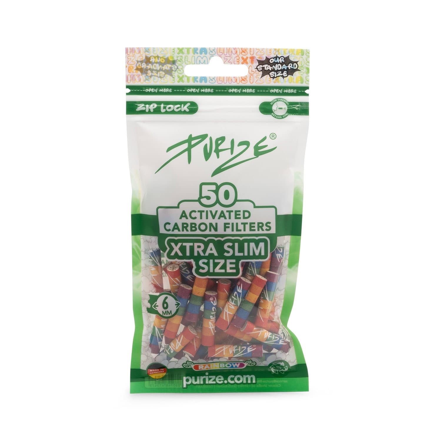 50-pack XTRA Slim-filter från PURIZE® i färgmixen Rainbow. Varje filter mäter ø 6 mm x 27 mm och är fyllda med aktivt kol baserat på kokosnötskal, vilket ger en svalare och mildare rökupplevelse. Filtren levereras i en återförslutningsbar påse som skyddar mot fukt och yttre påverkan.
