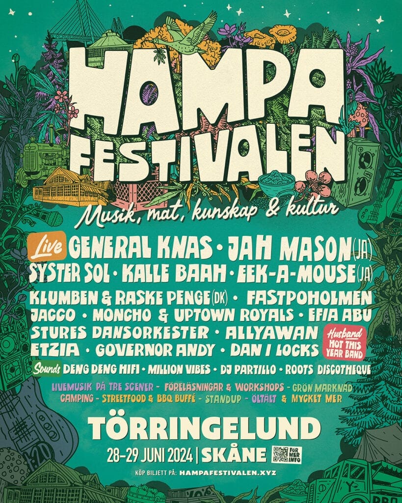Hampafestivalen, som hålls en kort resa från Malmö vid den anrika nöjesdestinationen Törringelund, lovar att vara en helg fylld av livemusik, dans, föreläsningar, standup, streetfood, och mycket mer. Med sin placering intill ett av Skånes charmiga naturreservat och omgiven av frodig åkermark, är Törringelund den idealiska platsen för en festival dedikerad till att öka medvetenheten och kunskapen om hampa.